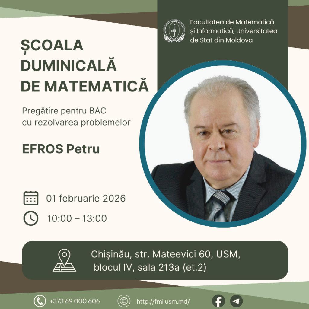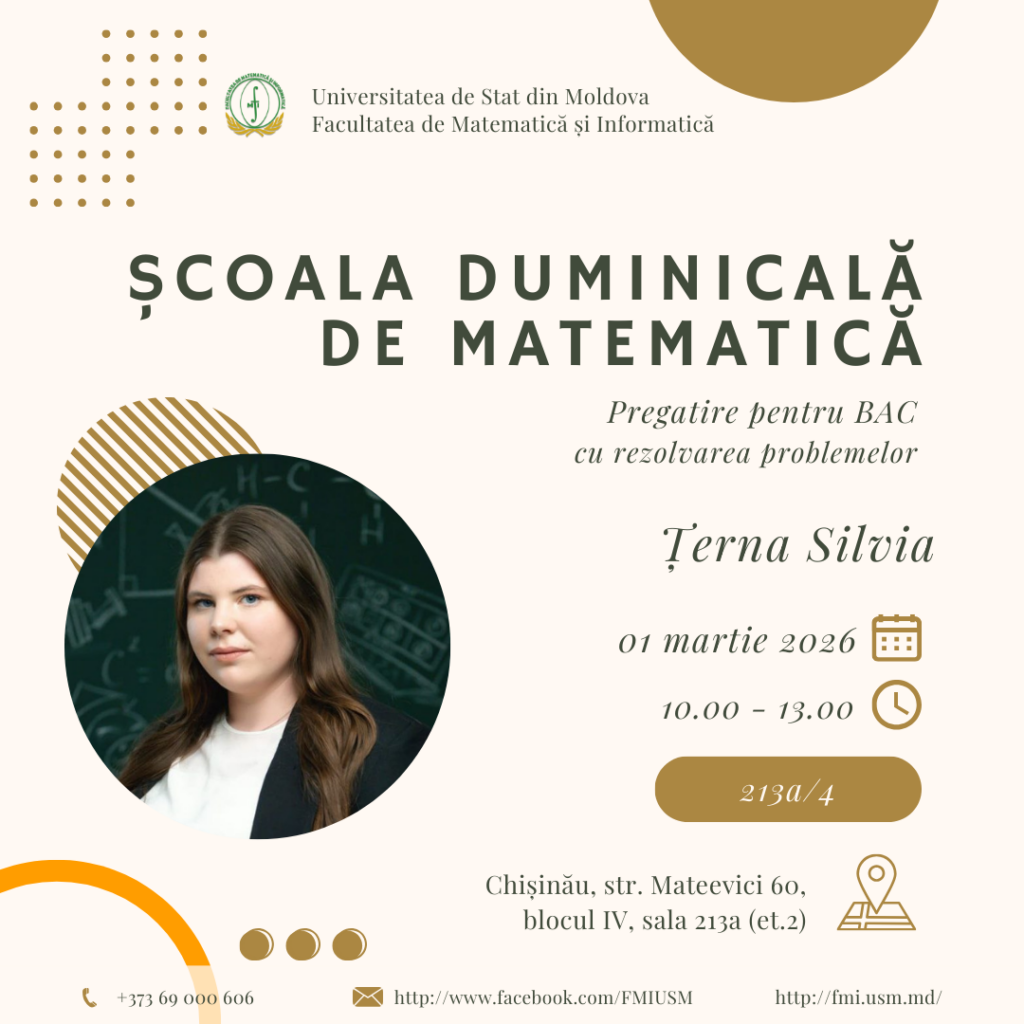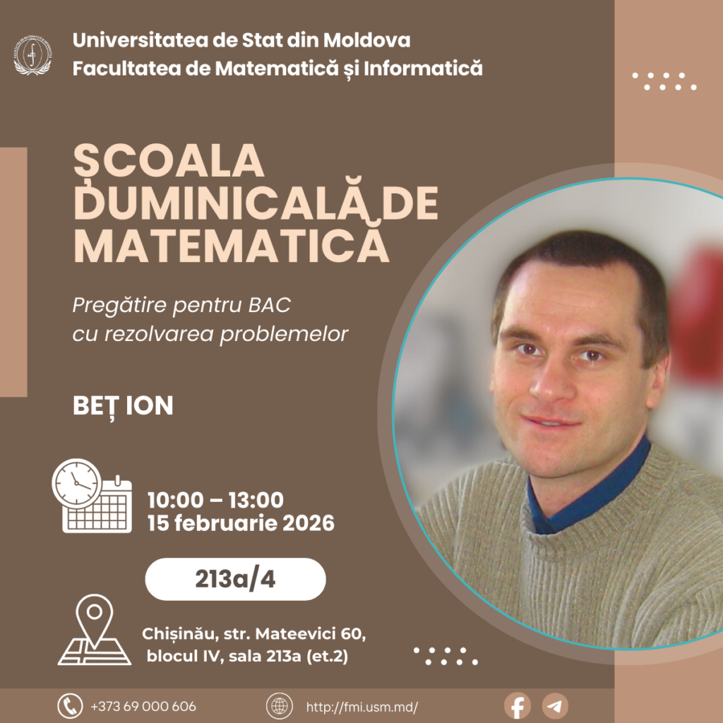 Vă invităm pe 29 martie 2026 la Școala Duminicală de Matematică Pregătirea pentru BAC cu rezolvarea problemelor Tema: Integrala. Aria subgraficului funcției. Primitiva. Volumul corpului de rotații. Așteptăm cu drag elevii claselor X-XII, precum și toți cei pasionați de matematică să participe la această experiență educațională valoroasă. Cu considerație, Echipa Școlii Duminicale de Matematică (ȘDM)…