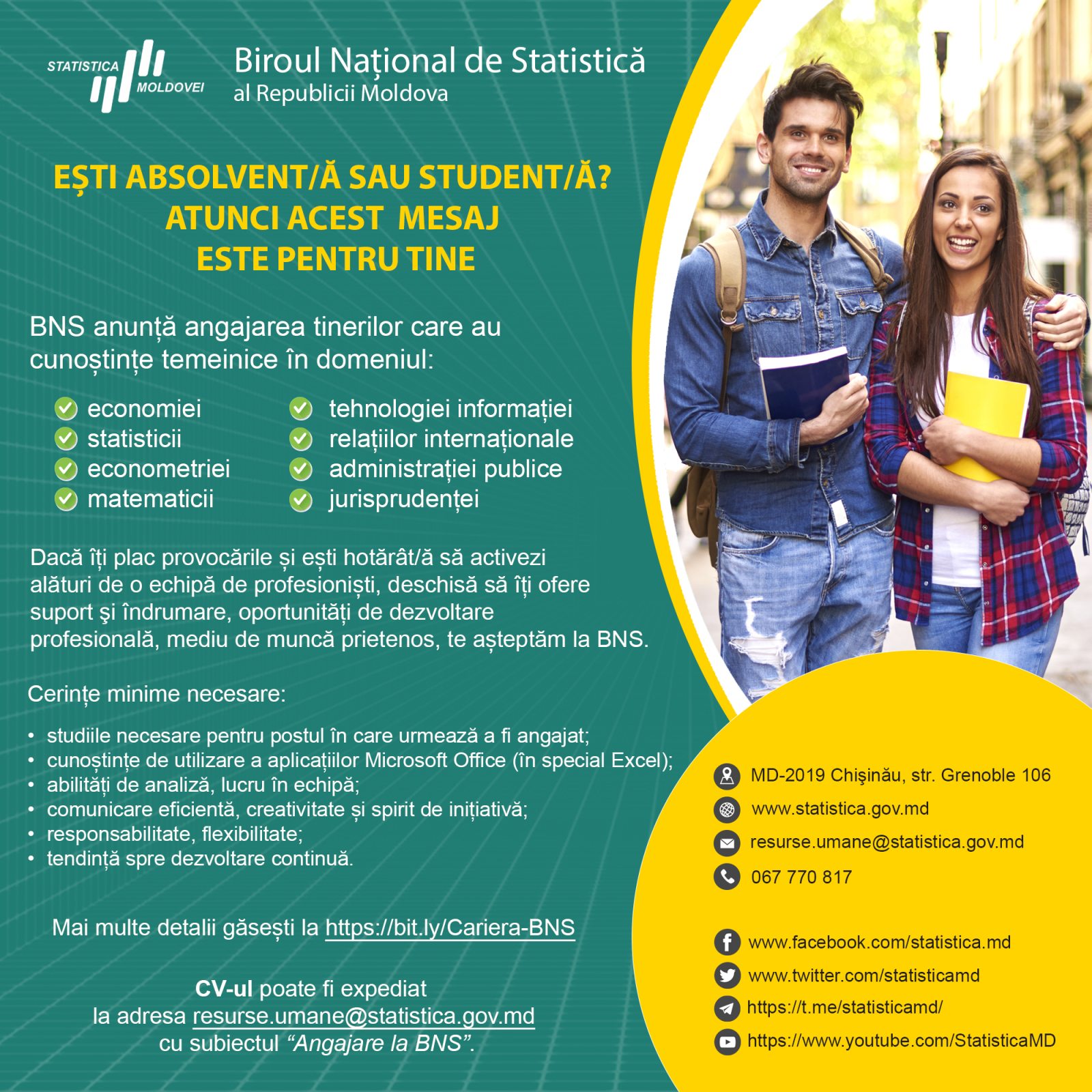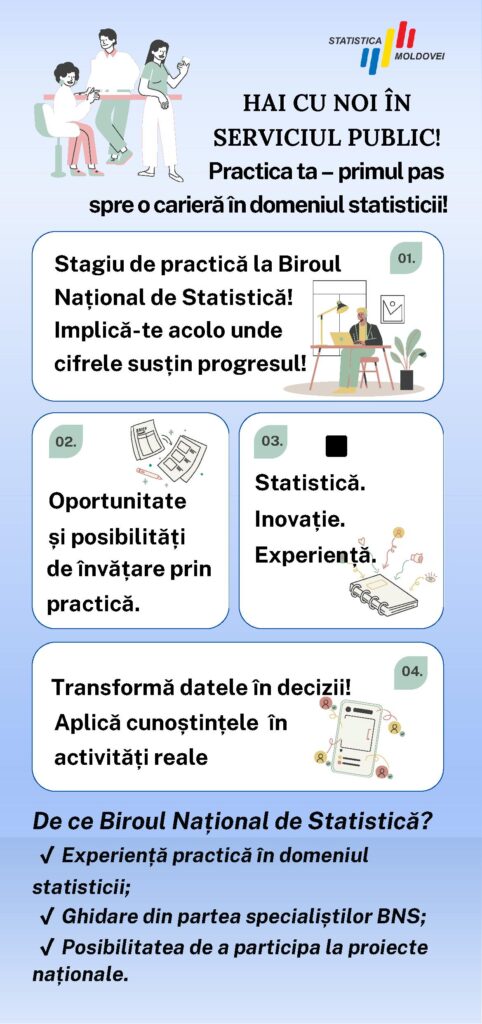 Biroul Național de Statistică oferă oportunitatea de angajare, precum și de a desfășura un stagiu de practică, studenților/masteranzilor specializați în domeniul statistic, economic, matematic, tehnologia informației, relații internaționale șî alte domenii relevante.